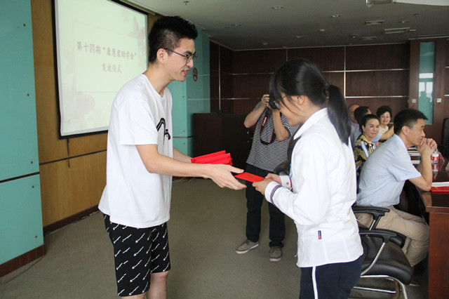 7月4日,宁波市鄞州高级中学的11楼会议室内,第十四期“康慧君助学金”发放仪式举行,50名鄞州籍贫困学生从康慧君儿子徐秉源的手中接过助学金。