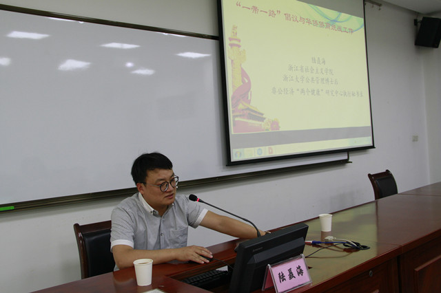浙江大学博士后、省社会主义学院陆聂海教授以《“一带一路”倡议与华侨华商统战工作》为题,从国家战略、实现中华民族伟大复兴的高度,全面阐述了“一带一路”倡议提出的历史必然、如何推进“一带一路”建设以及海外统战工作等问题,进一步激发了广大侨商参与“一带一路”建设的积极性。