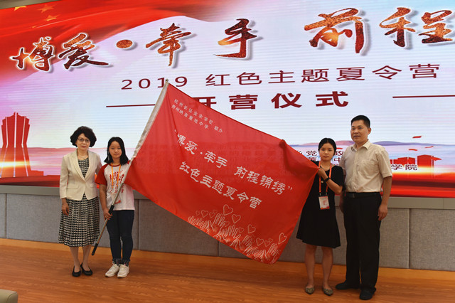 开营仪式上,陈励君监事长和亓述伟秘书长向夏令营营员代表授营旗。