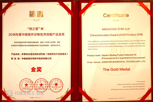 11月27日,浙江省经信厅公布了2020年度浙江省装备制造业重点领域首台(套)产品认定结果 ,全省今年共认定了国内首台套产品4项,省内首台套产品97项,其中中翰盛泰生物技术股份有限公司的“肝素结合蛋白检测试剂盒”被认定为省内首台套产品,这也是中翰盛泰继Jet-iStar3000免疫分析仪后第二个获得首台套认定的创新产品。