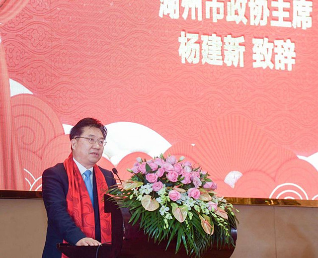 杨建新代表市政协和市四套班子领导向广大侨商以及旅居海外及港澳地区的湖州乡亲致以新春的祝福。他说,2020年是高水平全面建成小康社会和“十三五”规划的收官之年。希望市侨商会继续团结和带领广大侨商,更加积极主动地参与到全市高质量赶超发展的各项工作中来,展现新作为、开创新局面:一要创新发展,共享机遇。团结引导广大侨商、侨资企业把握时代大势,坚持创新驱动发展战略的理念,瞄准世界科技前沿,聚焦关键领域,加强关键核心技术研发,以创新促升级,共享湖州融入长三角一体化发展的历史机遇。二要服务会员,共享资源。坚持“服务会员、资源共享、抱团发展”的原则,不断加强自身建设,增强服务能力,时刻牢记办会初心,遵守商会章程,切实维护会员合法权益。三要以侨引侨,共赢未来。充分发挥侨商精英荟萃、海外联系广泛的独特优势,积极宣传推介湖州,吸引更多的侨商、高层次人才和创业团队来湖投资兴业,支持家乡建设,在合作中实现共赢。