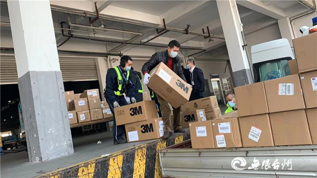 从杭州萧山机场卸货、装货,这批口罩第一时间运往台州,其中1.8万只N95 1860口罩直接送至台州医院,其余的将支援椒江区及各乡镇街道等。