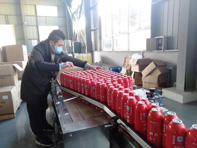 因缺乏包装材料,公司直接将原本用于生产灭火剂的铝制瓶体,投用于生产500毫升装的民用次氯酸钠消毒液。“由这种铝制瓶体喷出的水雾颗粒小,消毒效果会更佳,可有效喷洒消毒20—30平方米。”俞曙说。