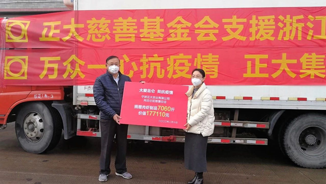 宁波正大农业有限公司向浙江宁波市北仑区慈善总会、北仑区人民政府大碶街道办事处捐赠洛大猪肉产品和正大对虾
