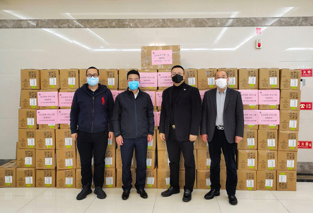 2月28日,宁波市侨商会会长徐旭昶、执行会长朱海宏与秘书处一同将260箱(6240瓶)消毒喷剂和50把额温枪(总价值23万余元)通过宁波市慈善总会,定向捐助给宁波市教育局。市教育局党委书记、局长朱达,市教育局党委委员、副局长、二级巡视员舒月明等接待了徐旭昶会长一行,并代表教育系统接收该批物资。