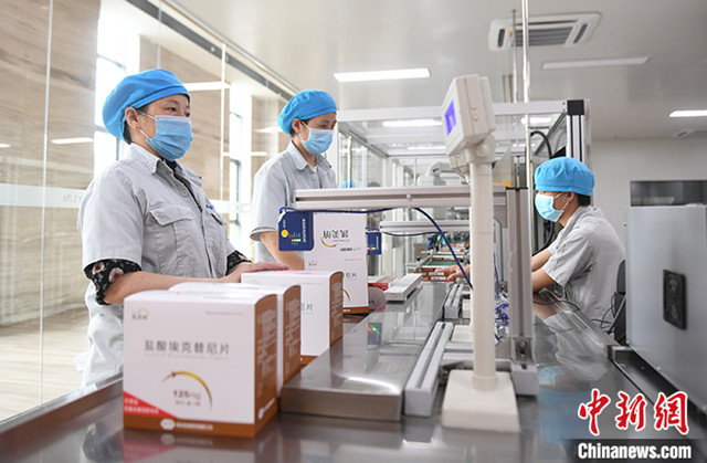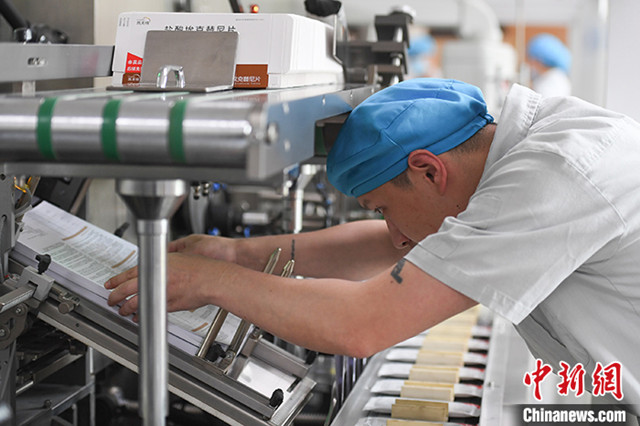 图为5月15日,浙江杭州,贝达药业股份有限公司生产车间内,工作人员在包装药品。