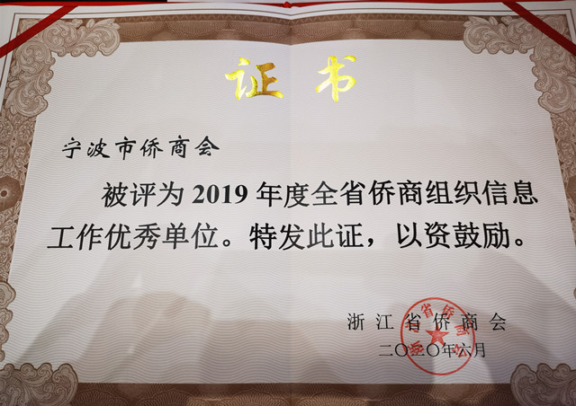 培训班上,浙江省侨商会表彰了全省侨商组织2019年信息工作优秀单位和优秀通讯员,宁波市侨商会再获全省侨商组织信息工作优秀单位称号,这已经是宁波市侨商会连续八年获得该称号,信息员鲁冠芬再获优秀通讯员称号。