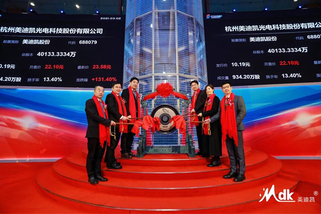 3月2日,杭州美迪凯光电科技股份有限公司正式登陆上交所科创板,公司代码为688079。浙江省侨商会常务理事、台州市侨商会副会长、杭州美迪凯光电科技股份有限公司董事/合伙人夏利敏在上交所共庆鸣锣开市。