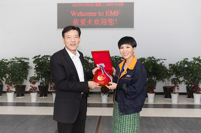 3月30日,平湖市人大常委会副主任、市经信局局长刘皆安专程到浙江依爱夫游戏装文化产业有限公司,为公司董事长汪维佳送上沉甸甸的“功勋企业家”金制奖章和荣誉证书。