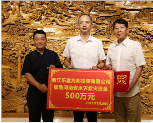 7月29日,浙江省侨联兼职副主席、浙江省侨商会副会长、泰普控股集团董事长杨宝庆代表浙江乐富海邦投资有限公司,向浙江省侨联捐赠500万元现金援助河南省受灾地区。浙江省侨联党组成员、副主席兼秘书长周松一接受捐赠,并表示该善款将用于助力河南水灾后重建和帮困等公益行动。