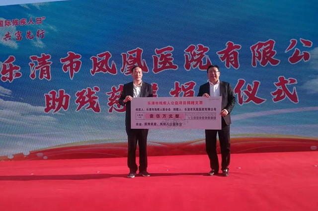 在庆典活动上,乐清市残疾人联合会理事长包建武接受了凤凰医院100万元爱心助残共富资金捐赠,乐清市副市长郑巨化为凤凰医院颁发“乐善好施 公德永存”牌匾。