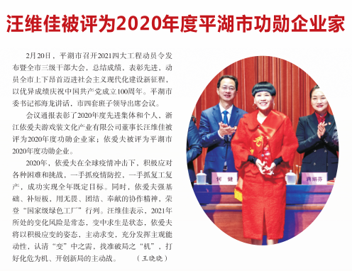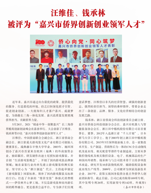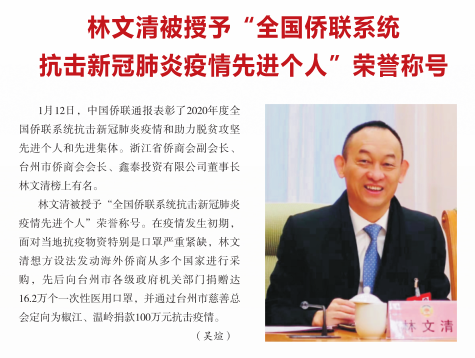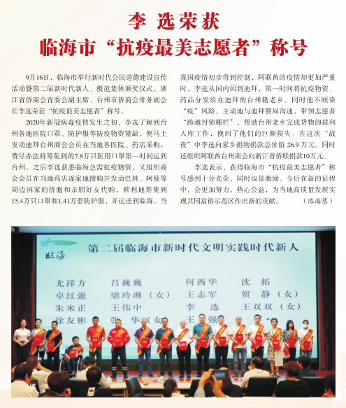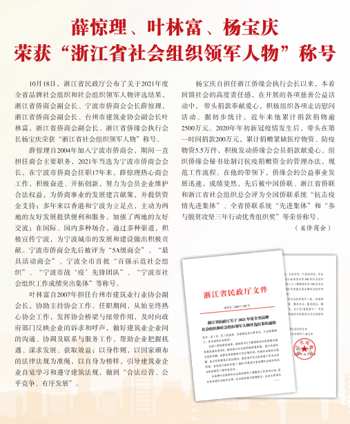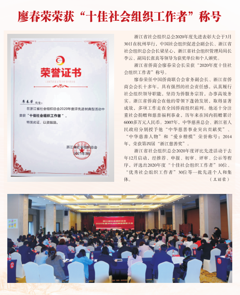 同时,多位省侨商会领导和专业委员会负责人获得了上级部门授予的荣誉称号:会长廖春荣荣获“十佳社会组织工作者”称号;副会长林文清被授予“全国侨联系统抗击新冠肺炎疫情先进个人”荣誉称号;副会长薛惊理、叶林富、杨宝庆被评为“浙江省社会组织领军人物”;副会长汪维佳被评为“嘉兴市侨界创新创业领军人才”“平湖市功勋企业家”和“初心反哺”新乡贤典范;副会长姚力军荣获“全国杰出专业技术人才”称号;副会长李方西当选RCEP电气行业合作委员会中方委员;科创委副主席钱承林被评为“嘉兴市侨界创新创业领军人才”;青委会副主席李选荣获临海市“抗疫最美志愿者”称号。(省侨商会)
