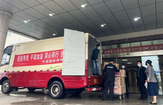 嘉兴市侨商会常务副会长陈坚第一时间安排企业紧急调货,加班加点配货,抢抓时间冒雨送货,向新埭镇人民政府、平湖市第一人民医院和新仓镇人民政府捐赠了2500套防护服、2500个KF95口罩、230桶消毒液、800瓶免洗洁净洗手液以及矿泉水、蛋糕、面包、方便面等食品共12000份,价值约37万元。不仅如此,企业还动员员工主动奉献,加入新埭镇疫情防控第一线协助开展测温、扫码、维持秩序等工作。