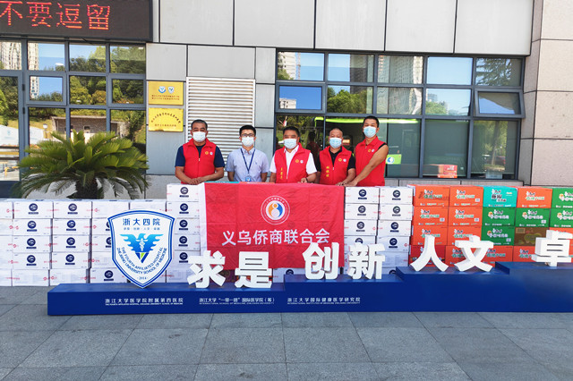 8月9日,义乌侨商联合会常务副会长王芳茂、理事黄唐兵,监事林振梭等赴浙大四院慰问抗疫在一线的医护人员。