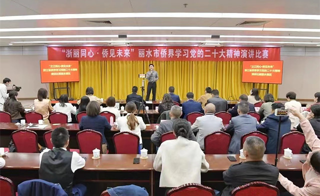 演讲比赛创新学。市侨商会组织20余名会员代表现场观看“浙丽同心·侨见未来”全市侨界学习二十大精神演讲比赛,引导侨界讲好中国故事,做好扎根丽水、逐梦丽水的“代言人”,当好反哺家乡、助力共富的“生力军”。