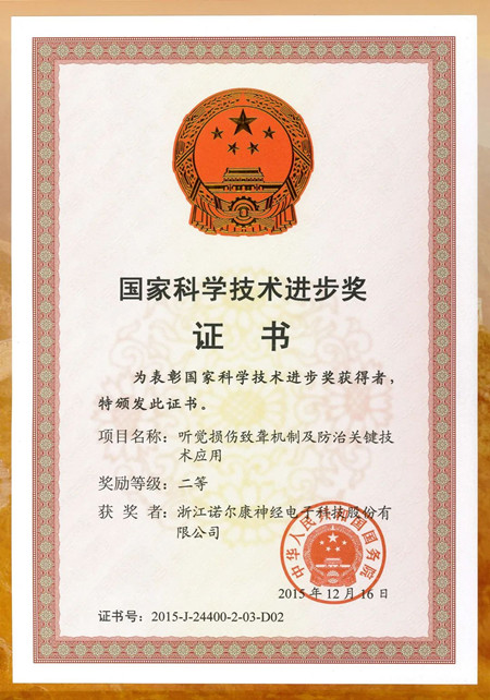 2016年1月8日,2015年国家科学技术奖励大会在北京人民大会堂隆重举行。诺尔康自主研发生产的人工耳蜗以“军事声损伤致聋机制及防治关键技术应用”课题经过层层筛选,在众多竞争对手中脱颖而出,荣获国家科技进步二等奖。
