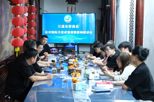 4月18日,面对美国政府频繁加征关税引发的国际贸易变局,兰溪市侨商会召开“应对国际关税政策调整影响座谈会”,来自南非、尼日利亚、澳大利亚、墨西哥、美国、德国、巴西等国家和地区的侨商代表齐聚一堂,共商破局良策。市侨商会会长黄屏主持会议并讲话,兰溪市委统战部副部长、侨办主任何捷出席会议。