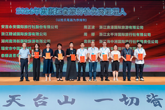 7月7日,浙江省旅行社行业发展交流大会暨浙江省旅行社协会第九次会员代表大会在台州召开。会上隆重举行了2024年度“浙江省百强旅行社”及“浙江省旅行社优秀经理人”颁奖仪式。其中,舟山市侨商会理事、浙江太平洋国际旅行社有限公司总经理周娜荣获“2024年度浙江省旅行社优秀经理人”称号。