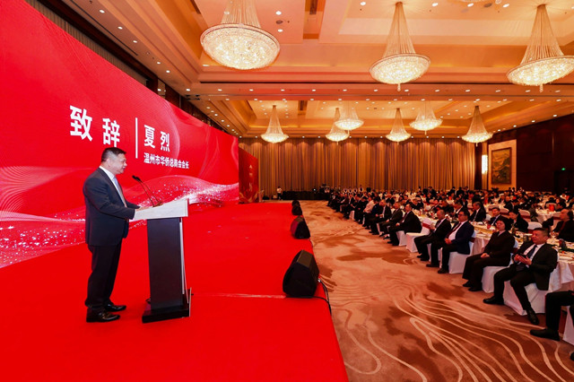 温州市华侨总商会会长夏烈致辞,他表示2025年温州市华侨总商会在服务侨企、搭建平台、凝聚合力等方面取得了丰硕成果,2026年将继续团结引领广大侨胞厚植家国情怀、激发创新活力,在温州“一圈一极一中心”建设与高质量发展中贡献更多侨界力量。
