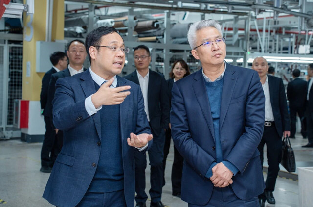 在金蝉智能生产车间,调研团现场感受智能吊挂系统、数字立库系统和AGV机器人分拣系统等在柔性制造领域的全场景应用,仔细询问其核心运转逻辑及提质增效能力。