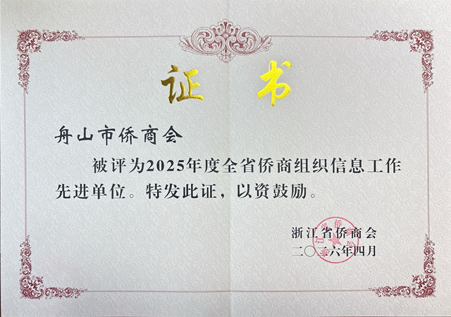 会上,对2025年度全省侨商组织信息工作17家先进侨商组织(会员企业)和17位优秀通讯员进行了表彰,并颁发荣誉证书。其中舟山市侨商会荣获“先进单位”称号,副秘书长徐翔荣获“优秀通讯员”称号。