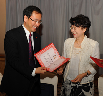 曹其镛会长向新当选的刘芸副会长颁授证书