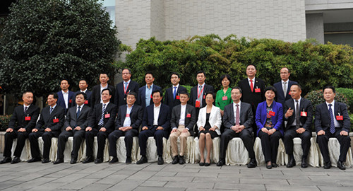 省领导王辉忠(前左六)、梁黎明(前左八)、孙文友(前左四)与浙商总会会长、副会长、顾问合影,后左四为廖春荣。