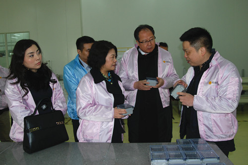 在尚越光电科技有限公司走访慰问,左二为吴晶副主席,右二为廖春荣会长,左一为吴超英副会长
