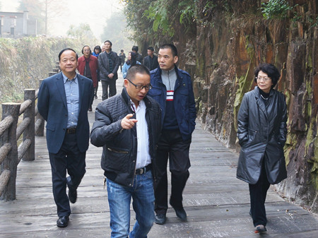 陈励君(前右一)一行在旅游开发景区考察。前左一为王关水副会长
