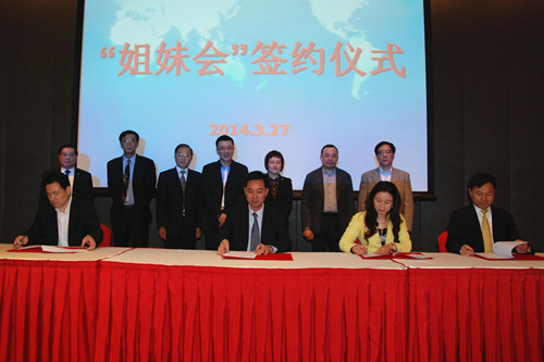浙江省侨商会副会长戴其丰(右一)与上海市华商会副会长蔡红专(右二)在友好商会协议书上签字
