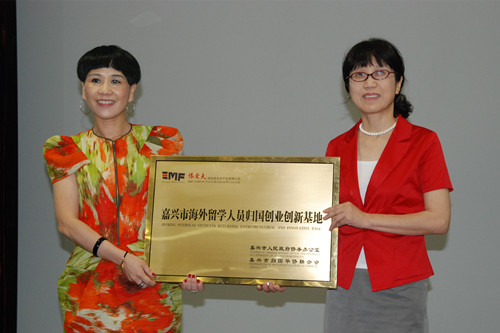 嘉兴市委统战部副部长、市侨办主任浦金英(右)为开心梦工场授牌——嘉兴海外留学人员归国创业创新基地