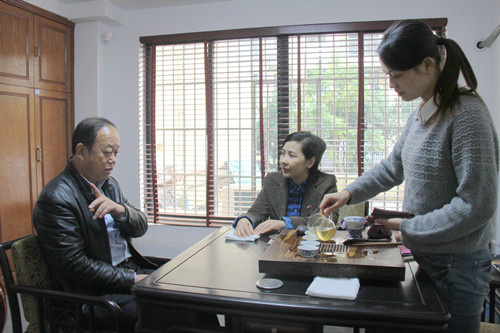顾鹤鸣(左)与汪丽珍(中)交谈