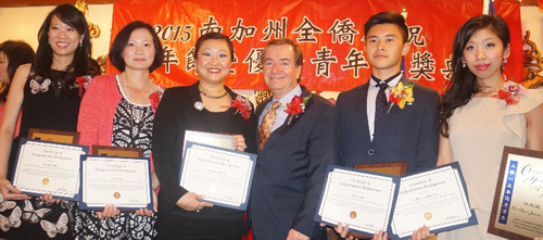 据AACYF洛杉矶讯 由南加州罗省中华会馆主办的第73届华裔优秀青年奖颁奖典礼3月27日晚,在洛杉矶中国城内隆重举行,美国国会众议员、众议院外交事务委员会主席爱德华•罗伊斯 (Ed Royce)为18名2015年度南加州华裔优秀青年获奖者逐一颁发了由他签署的国会祝贺状。近500名南加州全侨各界人士出席了当天的颁奖典礼。