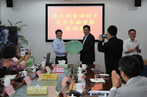 最近,意大利青田同乡总会洪森淼会长一行12人在丽水市外侨办副主任金晓伟陪同下,赴松阳县、丽水经济技术开发区等地进行考察。丽水市副市长、经济技术开发区管委会主任陈景飞,经济技术开发区管委会副主任施锦华和松阳县委副书记、县长王峻,副县长张健,县委统战部部长留洁等领导分别与考察团一行进行座谈交流。