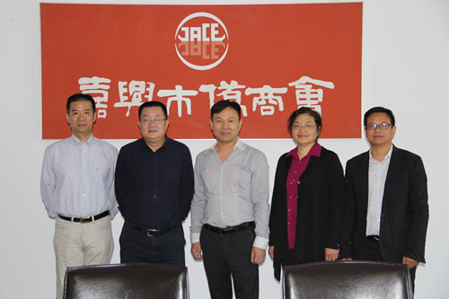 朱永明主任(左二)、娄新生副主任(右二)在嘉兴市侨商会走访。左三为戴其丰会长