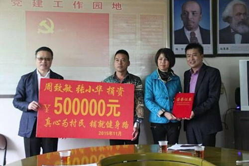 周致敏夫妇常年在海外经商,每每回家,家乡的变化让他们感触良多。“每次回乡都想为家乡做一点力所能及的事情。”周致敏说,此次听闻家乡道路不畅,便想为村里修建一条健身之道,方便村民安全通行。