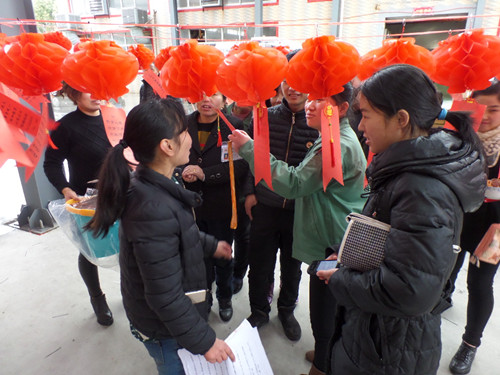 活动现场,每个红色小灯笼下面都贴有一道题,共有100道有关于猜字、植物、地名及日常用品的谜题,猜对谜题的员工就有一份礼品。看着一个个有趣而有深度的谜题大家争先恐后,积极作答,很多员工都是相互一起讨论,一起寻找答案。活动全程持续了一个小时,在这一个小时中,场面到处充斥着欢声笑语。