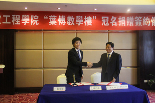 宁波市侨商会副会长、超竣电器(奉化)制造有限公司总经理叶峻棓冠名捐赠宁波工程学院“叶傅教学楼”200万元签约仪式于近日举行。宁波工程学院党委书记苏志刚,宁波市侨办主任顾正为,宁波市侨商会会长徐旭昶,执行会长朱海宏,常务副会长吴昌永,副会长杨琪、徐继钢等参加了此次活动。