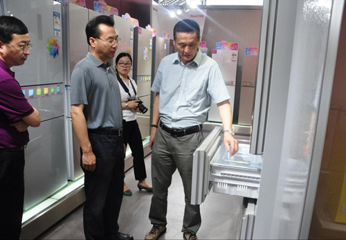 韩晓光一行参观了10万平方米的主厂房,详细了解了华日公司的发展历程,并重点听取了冰箱生产过程的介绍。看到华日公司的先进装备和智能化的运行,他表示,以前看过许多冰箱厂,但没有看到过这么先进的。在参观主厂房的国家级检测室时,他说,“今天来到华日,看到了中国家电制造业发展的强劲势头,看到了华日在行业中的领先水平”。