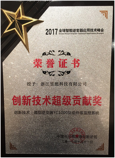 近日,由中国光伏测试网联合上海市太阳能学会共同打造的“2017全球智能逆变器应用技术峰会”在中华龙城 - 江苏常州盛大开幕。会议同期举行了“2017全球智能逆变器创新技术贡献奖”的颁奖盛典,浙江昱能科技有限公司微型逆变器 YC1000 及组件级监控系统荣获“创新技术超级贡献奖”。