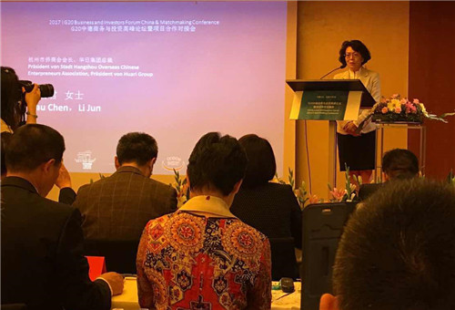省侨商会监事长、杭州市侨商会会长陈励君在中德商务与投资高峰论坛上作以“为我们共同的家园而努力”为主题的主旨演讲