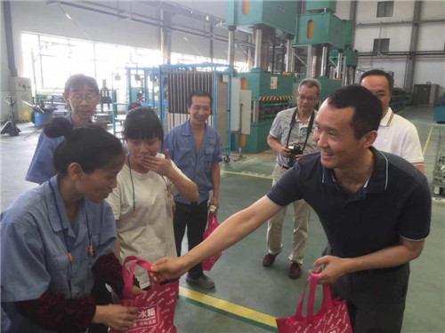 区纪委书记金晓东一行来到冰箱生产主厂区,看望慰问正在工作的一线员工,并亲手把防暑用品送到一线员工的手中。对大家不顾高温酷暑,仍然保持良好的状态和工作热情表示认可,并叮嘱大家要合理安排作息时间,注意身体。领导的关爱,给一线员工带去丝丝清凉的同时,也激励了他们的工作热情。同时,区领导们仔细询问了企业在高温情况下的生产经营情况,并为华日送上了暖心的高温慰问金。