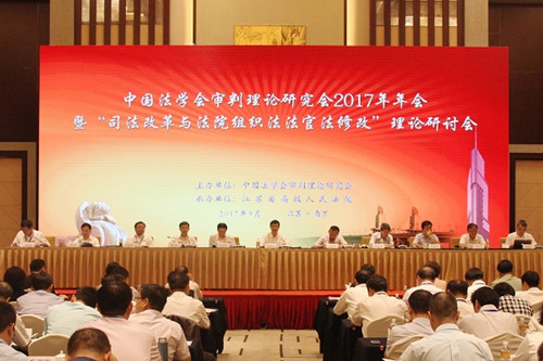 中国法学会审判理论研究会2017年年会暨“司法改革与法院组织法法官法修改理论研讨会”近日在江苏南京召开,最高人民法院党组副书记、常务副院长、中国法学会审判理论研究会会长沈德咏作工作报告,江苏省委常委、政法委书记王立科致辞,最高人民法院党组副书记、副院长、中国法学会副会长江必新传达周强院长提出的要求,最高人民法院副院长、中国法学会审判理论研究会副会长李少平主持会议。