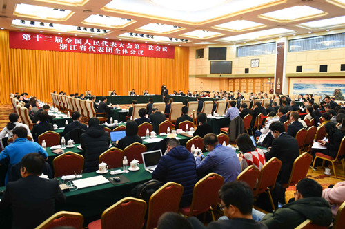 3月8日上午,浙江代表团在驻地举行全体会议,审议政府工作报告及审查计划报告、预算报告,推选监票人。会议向中外媒体开放,吸引了众多记者的目光,共有73家境内外媒体的112名记者到会采访。
