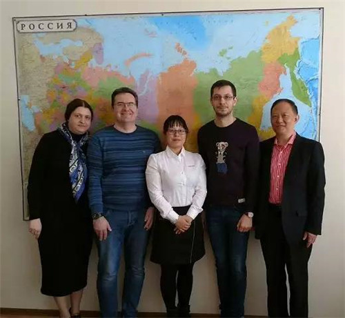 中俄专家在俄罗斯地图前合影(从左至右依次为俄罗斯听力师Liya,俄罗斯专家苏希宁教授,诺尔康听力师高珊仙,俄罗斯听力师Anthon,诺尔康常务副总银力)