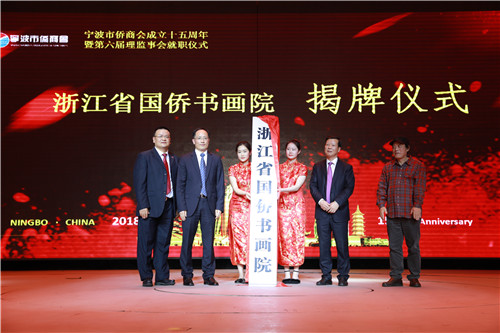 在当天的活动上,由宁波市侨商会发起成立的浙江省国侨书画院揭牌仪式也隆重举行。据悉,宁波市侨商会近年来积极开展书画艺术活动,宣扬中华民族优秀传统文化的同时,以书画为媒,凝聚侨心侨力。此次成立浙江省国侨书画院,旨在弘扬中国书画艺术、促进文化产业发展,书画院隶属浙江省文化厅主管,经浙江省民政厅批准建立,是集美术创作、研究、教育、收藏、鉴定、评估、普及和交流于一体的公益型文化机构。(卢静依)