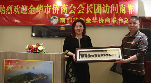 在南非约翰内斯堡,考察团一行与南非金华侨商联合总会等海外侨团进行了联谊交流并互赠纪念礼物,开展了“金华与南非侨商携手行”活动,参观了当地华侨投资的中非商城和部分华侨企业,了解了金华籍侨商在南非的投资项目和当地的投资环境及优惠政策,共同探讨了两地的项目合作前景,并就房地产开发项目达成初步意向。