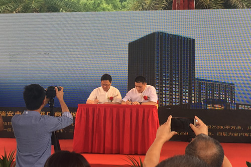开幕式上,西班牙侨商余宾代表瑞安市侨贸进口商品城管理有限公司与侨贸小镇签订投资协议,投资项目“瑞安市国际进口商品城”,项目地址在侨贸小镇五洲商贸城南地块,投资金额达1亿元。