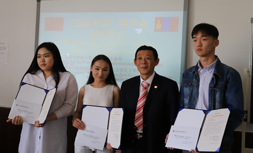 最近,中蒙文化教育暨社会发展基金会蒙古国东阳商会2018年度“成就梦想”专项助学金发放仪式在蒙古国立大学第二教学楼举行。蒙古国立大学恩赫玛、恩赫格日乐、毕力格特赛汗三名汉语专业学生分别获得102万图格里克(约合3000元人民币)助学金。