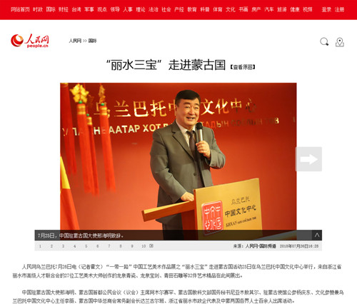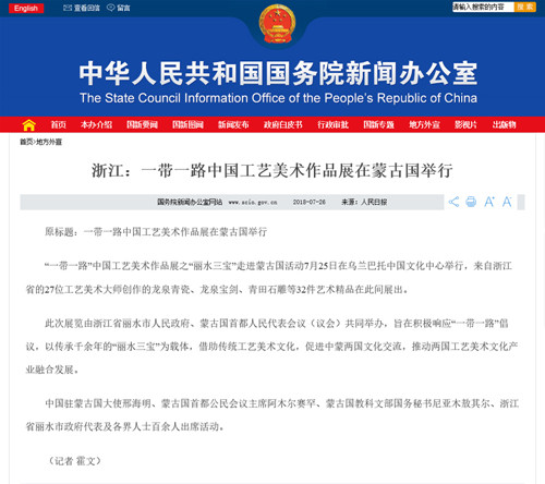 近日,由蒙古国首都人民代表会议(议会)、中共丽水市人民政府、中国工艺美术协会中国艺品网、浙江省二轻集团公司主办的“一带一路”中国工艺美术精品全球展——第一站:“丽水三宝”专家作品走进蒙古国活动在蒙古国首都乌兰巴托蒙古国中国文化中心隆重开幕。